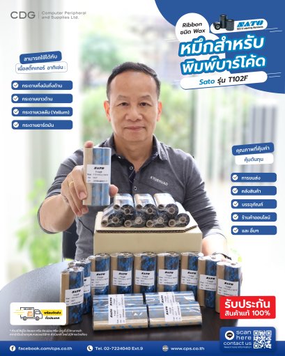 ริบบอน ชนิด Wax แบรนด์ซาโต้ รุ่น T102F ซึ่งเป็นชนิดที่ได้รับการยอมรับกันอย่างกว้างขวางถึงคุณภาพที่คุ้มค่า คุ้มต้นทน