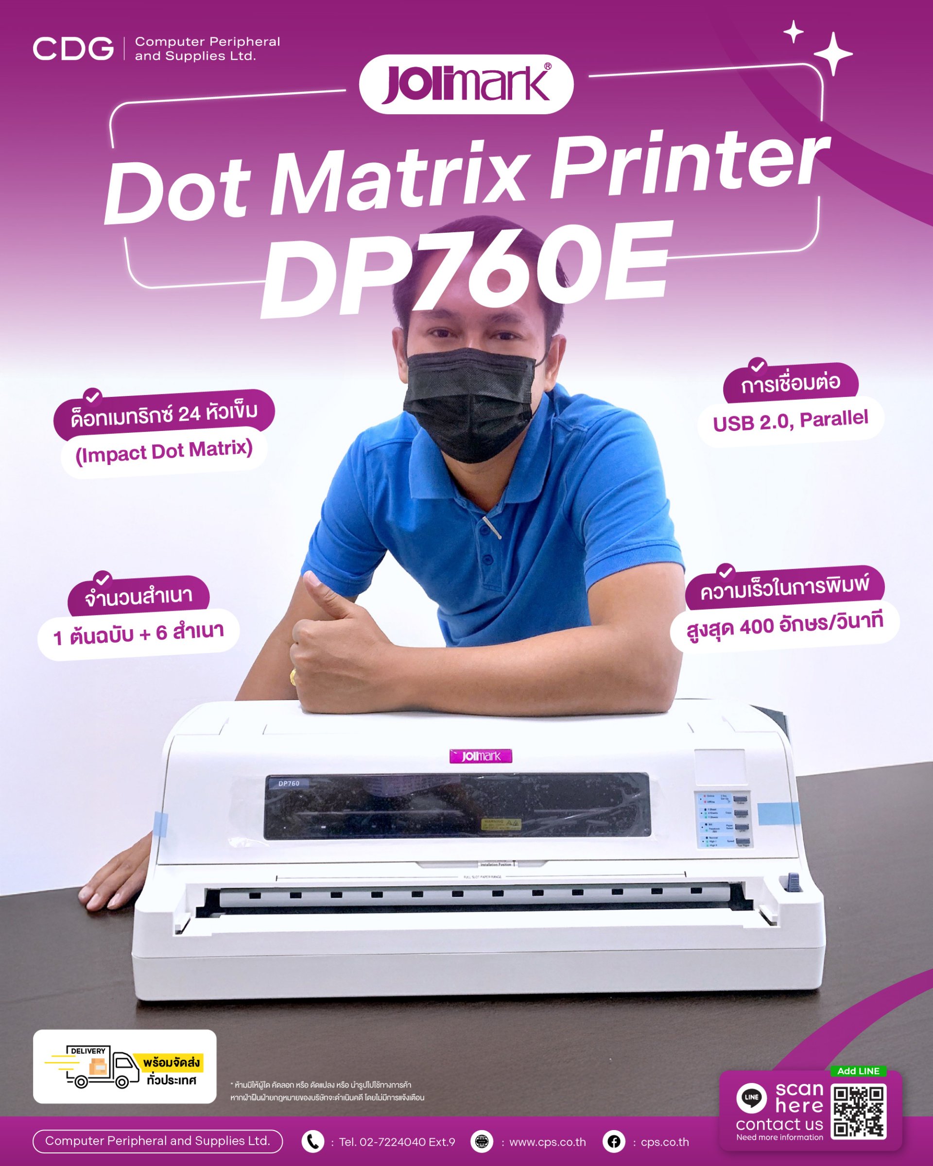 Jolimark DP760 เป็น เครื่องพิมพ์ด็อทเมทริกซ์ แบบ 24 เข็มที่ออกแบบมาเพื่อรองรับงานพิมพ์เอกสารหลายประเภท เช่น ฟอร์มต่อเนื่อง สมุดบัญชี และเอกสารราชการ ด้วยความเร็วสูงสุดถึง 400 ตัวอักษรต่อวินาที พร้อมระบบตรวจจับขอบและการเบี้ยวของกระดาษอัตโนมัติ ช่วยให้การพิมพ์แม่นยำและลดความผิดพลาด รองรับการพิมพ์สำเนาได้ถึง 7 ชั้น และปรับความหนากระดาษอัตโนมัติเพื่อรักษาคุณภาพงานพิมพ์ ตัวเครื่องมีความทนทานสูง ใช้งานได้ต่อเนื่องในองค์กรขนาดใหญ่ และรองรับการเชื่อมต่อหลากหลาย เช่น USB, Parallel, Ethernet, Wi-Fi และ Bluetooth
